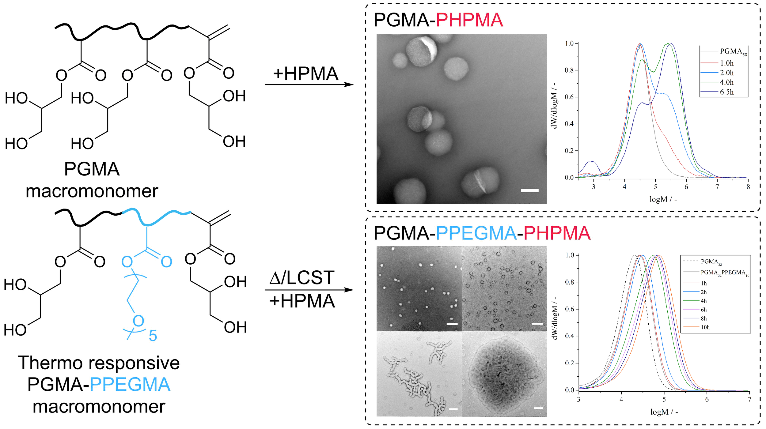 The use of this class of "primitive" RAFT-agents in heterogeneous polymerizations is however not trivial, because of their inherent low reactivity. In our work we demonstrate that two obstacles need to be overcome, one being control of chain-growth (propagation), the other monomer partitioning. Batch dispersion polymerizations of hydroxypropyl methacrylate in presence of poly(glycerol methacrylate) macromonomers in water showed limited control of chain-growth. Semi-continuous experiments whereby monomer was fed improved results only to some extent. Control of propagation is essential for PISA to allow for dynamic rearrangement of colloidal structures. We tackled the problem of monomer partitioning (caused by uncontrolled particle nucleation) by starting the polymerization with an amphiphilic thermo-responsive diblock copolymer, already “phase-separated” from solution. TEM analysis showed that PISA was successful and that different consecutive particle morphologies were obtained throughout the polymerization process.